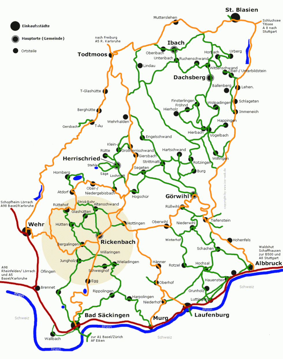 Die Gemeinde Rickenbach besteht neben dem Ort Rickenbach aus den Ortsteilen: » Altenschwand, » Bergalingen, » Egg, » Glashütten, » Hütten, » Hottingen, » Jungholz, » Rüttehof, » Schweighof, » Wieladingen und » Willaringen.