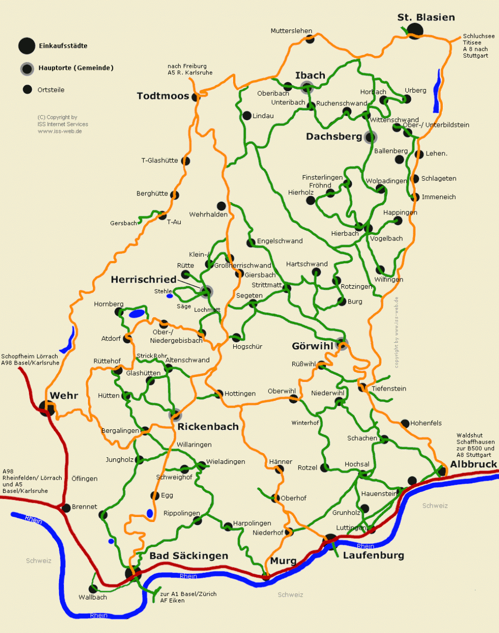 Dies sind Hänner, Binzgen, Rotzel, Hochsal, Niederhof, Oberhof, Harpolingen, Rippolingen, Hauenstein, Laufenburg, Bad Säckingen, Murg, Öflingen, Wehr, Todtmoos und St. Blasien.